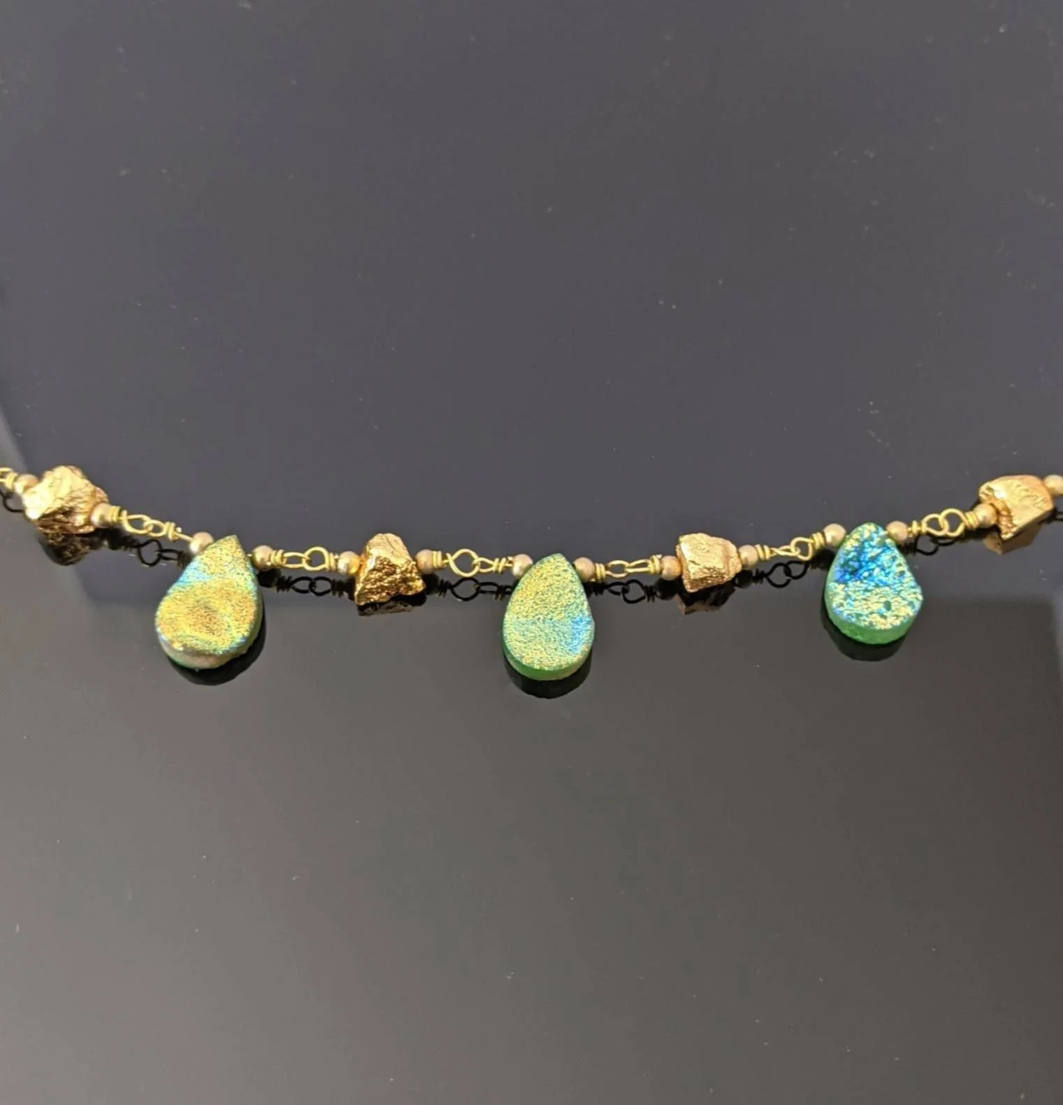 The great thing about nugget beads is that your eye is instantly drawn to them. I am obsessed with the gold pyrite nugget beads in this necklace, and they were the starting point for this design. A golden glow can also be seen in the titanium druzy teardrop beads here, so it seemed like a natural pairing.